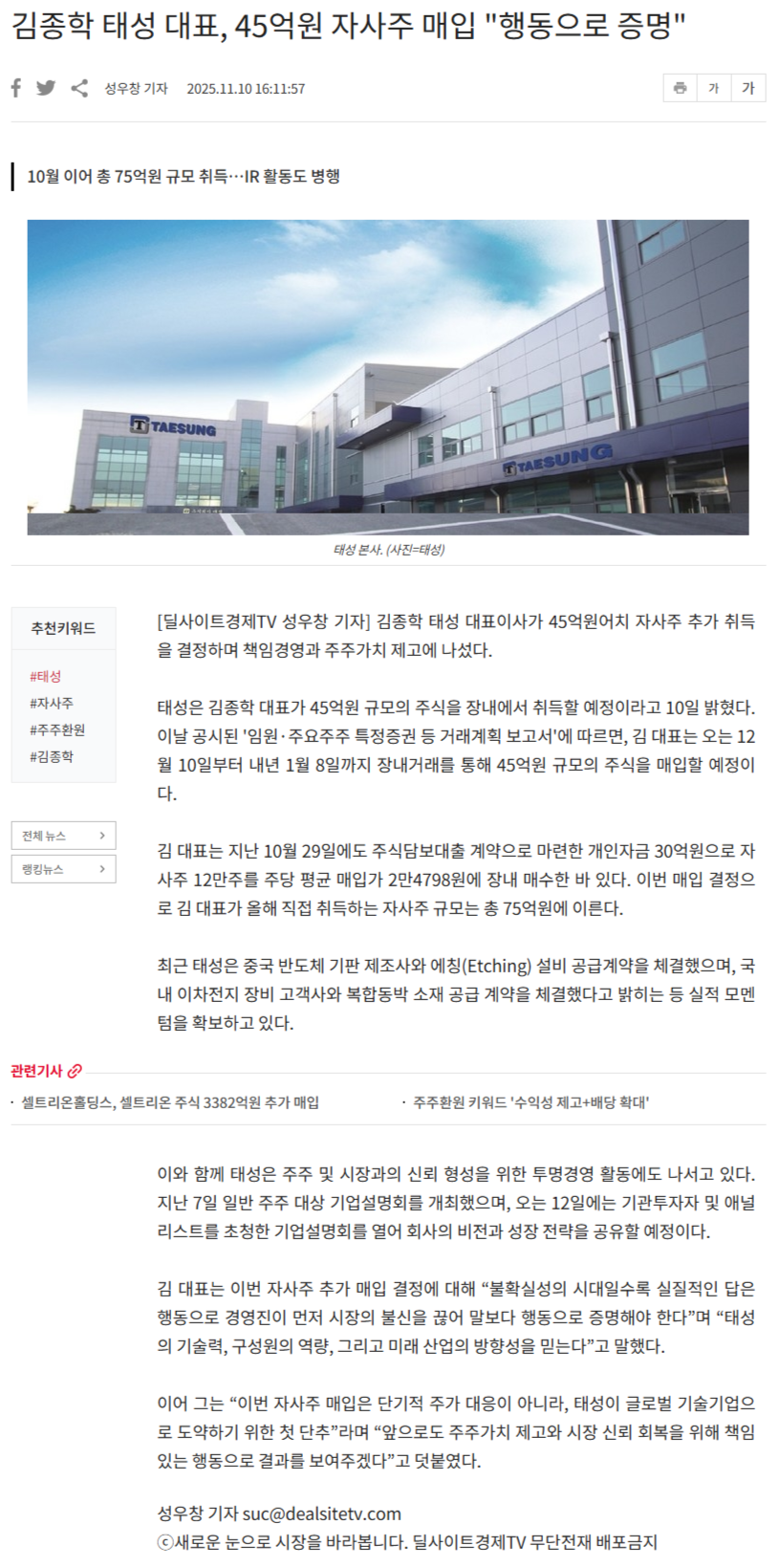 김종학 태성 대표, 45억원 자사주 매입