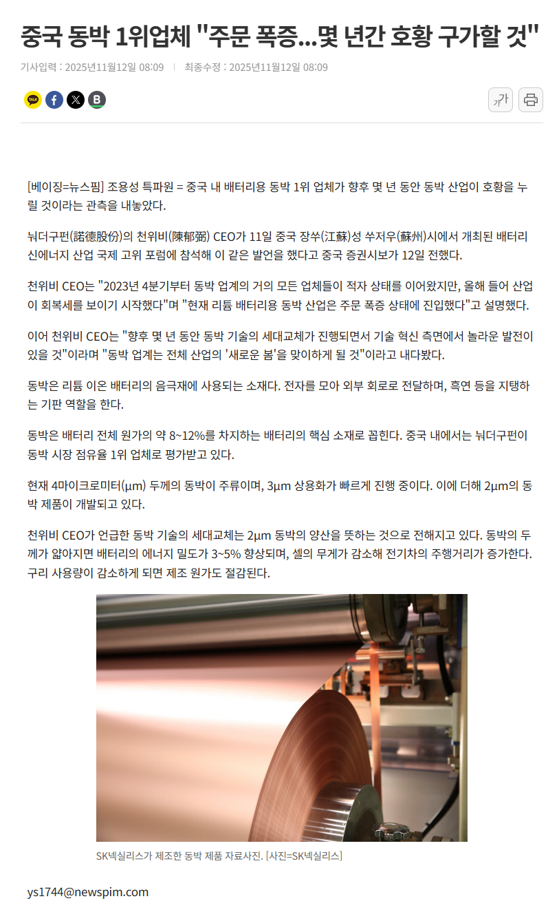 중국 동박 1위업체 "주문 폭증...몇 년간 호황 구가할 것"