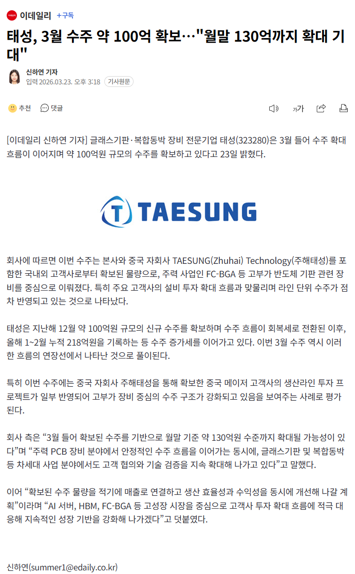 태성, 3월 수주 약 100억 확보…"월말 130억까지 확대 기대"
